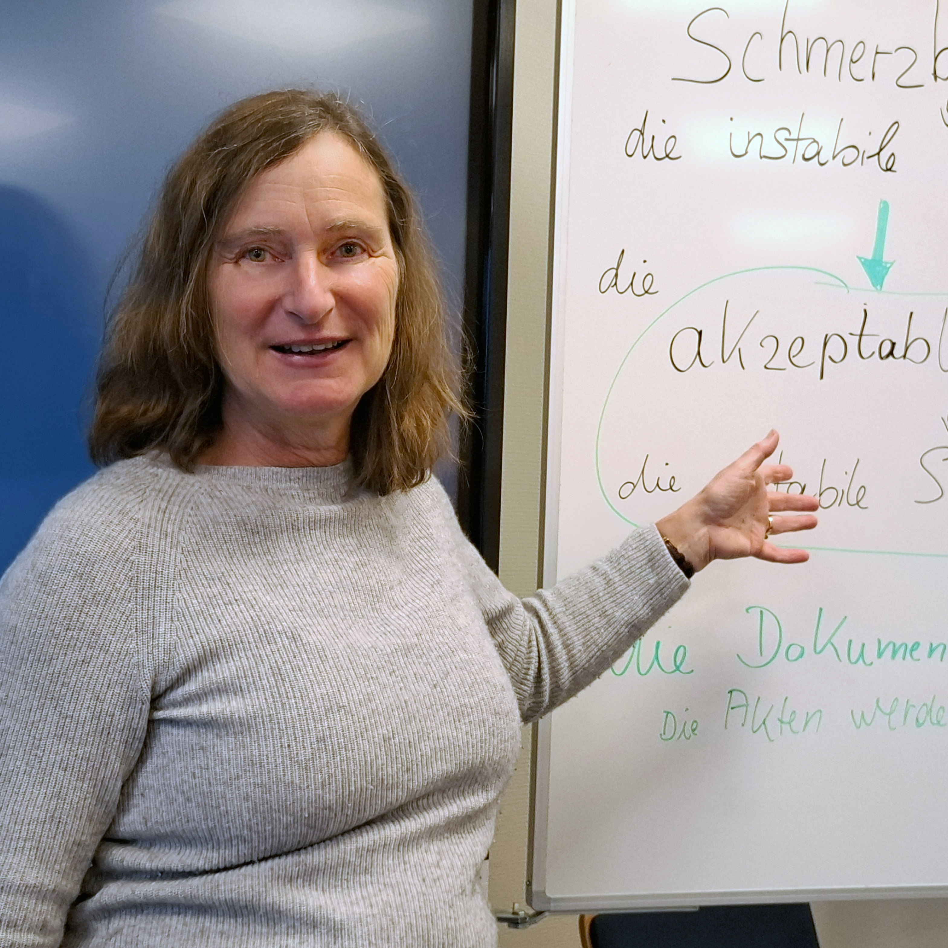 „Selbstmanagementkompetenz“ steht an der Tafel. Ein Bandwurmwort aus dem „Expertenstandard Schmerz“. Ein zentraler Begriff also. Insa Hinrichs blickt in die Klasse. Nicht alle Auszubildenden scheinen die Bedeutung zu verstehen. „Schauen wir doch mal nach, welche Worte darin stecken“, beginnt die Berufsschullehrerin. Und wirklich, der drei geteilte Begriff „Selbst-Management-Kompetenz“ wird zugänglich. „Das bedeutet, dass jemand mit seinen Schmerzen umgehen kann“, kommt es aus der Klasse. Insa Hinrichs bestätigt: „Genau. Ein Patient hat den Schmerz im Griff. Nicht umgekehrt.“ So sieht sprachsensibler Unterricht aus.
